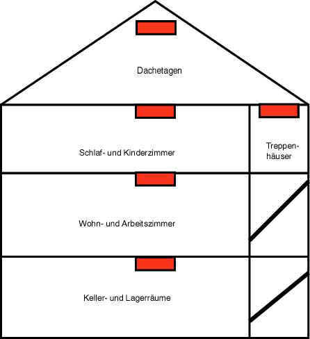 In größeren Häusern ist es sinnvoll die Rauchmelder miteinander zu vernetzen, so dass ein Kellerbrand auch von den in der Wohnung installierten Geräten gemeldet wird.